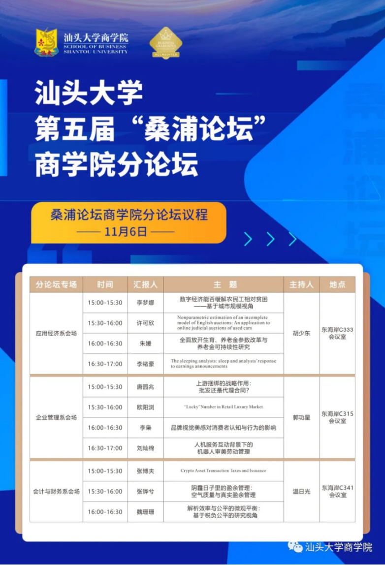 On the afternoon of November 6, 2023, the School of Business at Shantou University successfully held the fifth "Sanpu Forum" for international young scholars at the East Coast Campus. This sub-forum, which combined online and offline formats, attracted the attention of numerous young scholars. The sub-forum set up three parallel sub-venues for Business Administration Department, Applied Economics Department and Accounting and Finance Department, inviting more than 10 outstanding scholars from home and abroad to give special academic reports.