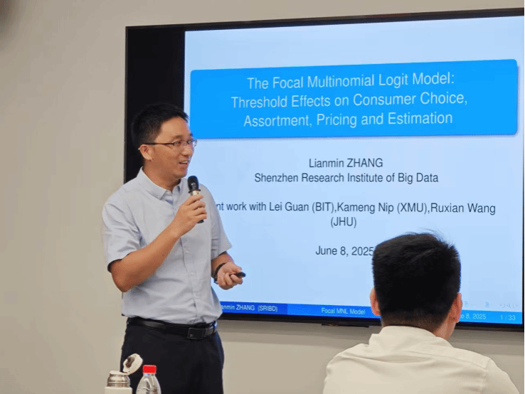 接着,深圳市大数据研究院高级研究科学家张莲民教授带来了Focal Multinomial Logit Model: Threshold Effects on Consumer Choice, Assortment and Pricing的报告。张教授从消费者行为角度出发,介绍了焦点多项逻辑回归模型(Focal Multinomial Logit Model)在消费者选择、产品组合和定价策略中的应用。张教授通过多个实际案例,如红酒购买、电子产品选择等,解释了该模型如何捕捉消费者在面对多种产品时的选择行为。他指出,消费者在选择产品时,不仅考虑产品的价格和性能,还受到参考价格、品牌效应、社会影响等因素的影响。基于该模型,企业可以更精准地制定产品组合和定价策略,提高市场竞争力。