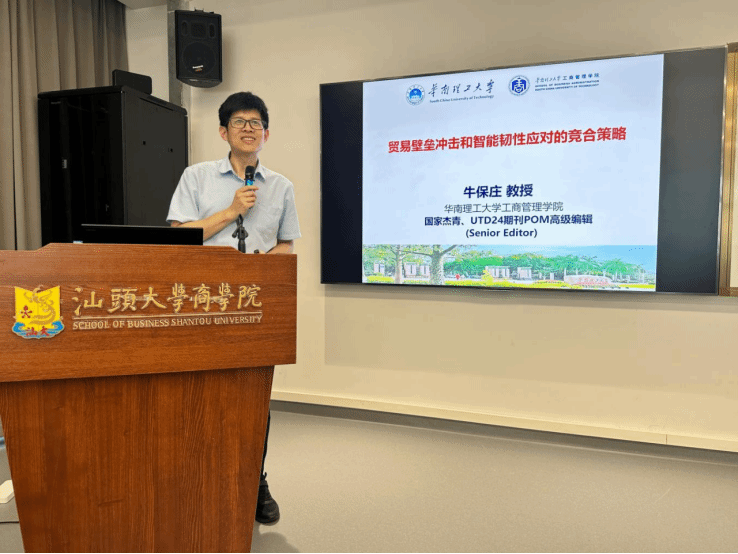 随后,华南理工大学二级教授、国家高层次人才项目获得者牛保庄教授带来了题为《贸易壁垒冲击和智能韧性应对的竞合策略》的主题报告。牛教授结合自己主持的国家自然科学基金重大项目课题“供应链韧性与安全基础理论”,从宏观视角分析了当前全球贸易环境的复杂性。牛教授指出,自2018年以来,全球供应链面临着贸易摩擦、疫情冲击、关税战等多重挑战,贸易壁垒日益多样化和极端化。他以关税高峰、关税升级和关税配额等典型贸易壁垒为例,深入剖析了其对企业运营和供应链管理的影响。牛教授强调,在这样的背景下,企业需要从多个维度构建智能韧性应对策略,包括利用AI技术进行风险预判和预警、通过数据驱动实现智能决策,以及构建新的商业生态实现灾后恢复。他认为,未来的研究需要更多地结合实际案例,探索在不确定环境下供应链的竞合优化方法。