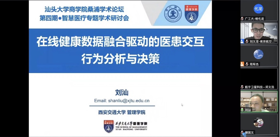 第二场报告由西安交通大学管理公司刘汕教授主讲,主题为“在线健康数据融合驱动的医患交互行为分析与决策”。刘汕教授介绍了传统医疗模式是以疾病为中心,对症下药;现代健康模式是以患者为中心,以人为本。存在的主要矛盾是个性化需求和有限的医疗资源之间供需不平衡,且信息不对称阻碍医患交互和沟通。破解的关键在于线上线下一体化全流程服务模式,利用互联网健康平台加强医患沟通。刘汕教授通过五个研究厘清患者的推荐搜索行为、在线咨询和就诊行为、医生语音交互行为、医生言语行为、医生语言风格对医患关系的影响。在互动讨论环节,刘汕教授针对提出的问题给予了详细的回答,包括针对研究中存在的标签数据的获取、分类准确率等。