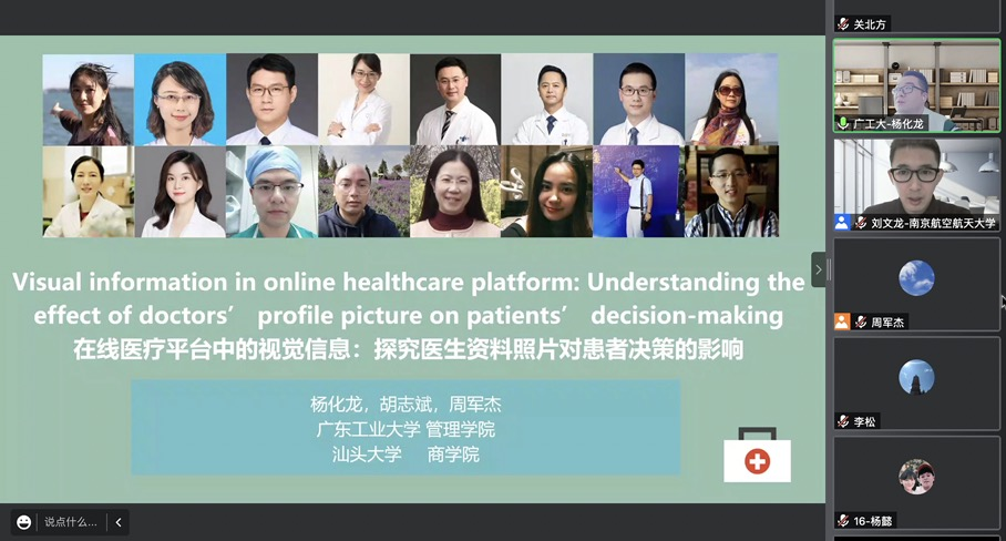 第一场报告由广东工业大学管理公司杨化龙副教授主讲,主题为“在线医疗平台中的视觉信息:探究医生资料照片对患者决策的影响”。杨化龙副教授首先与老师、同学们进行互动,通过照片选择医生,进一步说明医生资料照片对患者决策会影响,并且详细介绍了在线医疗的发展背景及先前的研究、在线医疗方面的研究,由此为了填补以前研究的不足,他的研究基于行为实验和实证研究,探究医生在线照片对于患者关注和择医选择的影响。杨化龙副教授指出,在线医疗平台中患者和医生无法进行面对面的交互,因此患者对医生的印象源自于医生的着装和背景,并可由此来影响患者的决策。通过预实验、正式实验及后验分析,对医生的着装及其背景对患者决策的影响进行了分析。同时,运用计量模型分析通过好大夫网站收集的研究数据,运用面板数据建立计量实证模型,进一步分析医生的在线照片对患者关注恶化择医选择的影响,建立双回归方程,并通过固定效应模型进行分析。