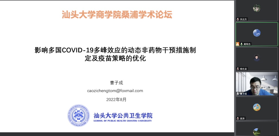 第五场报告由伟德国际唯一官网入口公共卫生公司曹子成讲师主讲,报告的题目是“影响多国COVID-19多峰效应的动态非药物干预措施制定及疫苗策略的优化”,该报告以COVID-19疫情在世界各国多次出现反弹现象入手,进行了实时、动态的疫情传播分析。采用例如疫苗实施前后、流行单双峰国家之间等多重对比方法,探讨非药物干预措施的对疫情传播的影响效应,挖掘其中的重要驱动因素。同时介绍了变异株及疫苗剂量对疫情传播的影响,均为动态非药物干预措施制定及疫苗策略的优化具有指导意义。最后报告还综合多维度因素对各国疫情反弹进行了短期预测、疫苗接种配合NPI实施对疾病负担影响的预测等等。在互动环节,曹博士详细回答了流行单双峰的界定对公共卫生具备什么样的意义等问题。