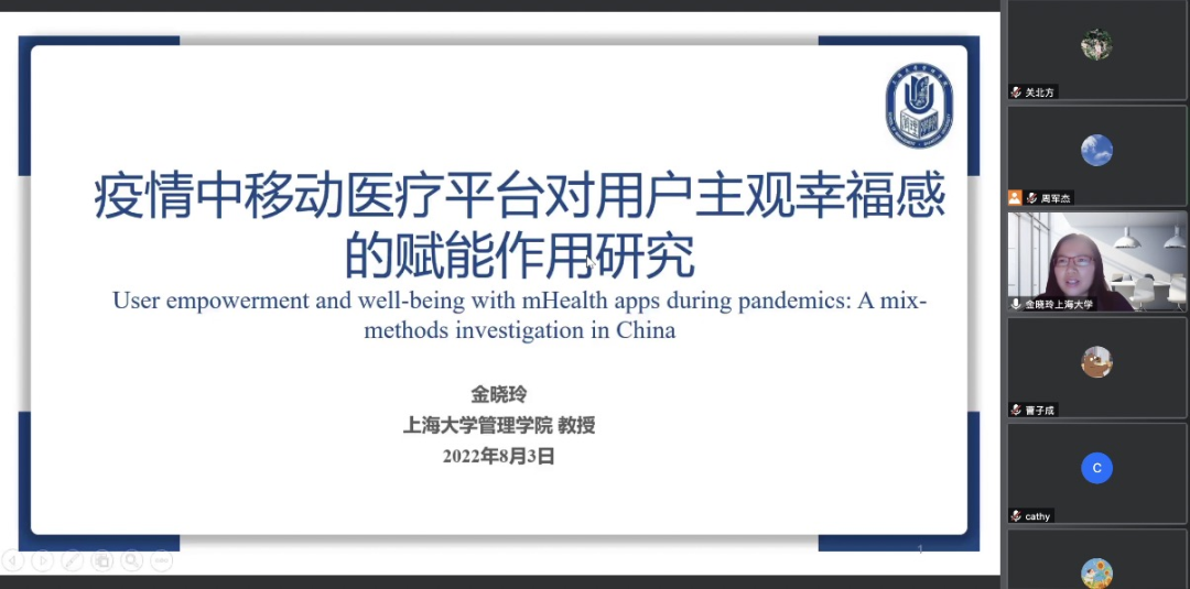 第四场由上海大学管理公司金晓玲教授主讲,主题为“疫情中移动医疗平台对用户主观幸福感的赋能作用研究”。本次报告主要探讨了疫情背景下移动医疗平台的赋能机制问题,创造性地提出了“移动医疗用户的心理赋能”(PEMU)的概念,通过定量-定性的顺序混合研究方法发现,PEMU受感知反应效能、易用性以及移动医疗平台质量三种技术因素的驱动,作用于用户的主观感知——产生活力或缓解压力。进一步研究发现在此作用机制中,事件的关键性具有显著的调节效应。这一研究极具理论和现实意义,有助于推动移动医疗平台的完善和发展。
