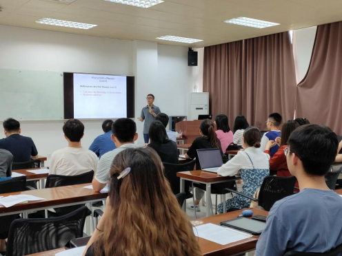 刘斌老师首先通过风趣诙谐的PPT向在场的师生梳理和探讨了何谓理论,从有章可循的英文论文写作角度详细阐述了理论的构建、检验和应用。并通过例举几个关于“质疑已定假设”的论文主题,引导大家挖掘有趣的研究主题,吸引编辑和读者的注意力。