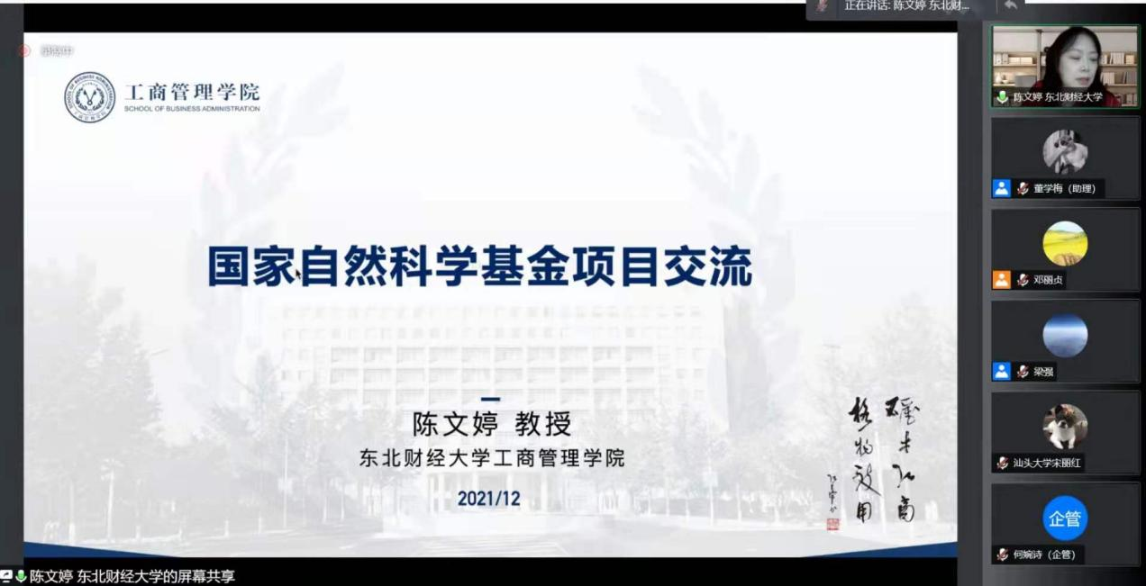 2021年12月8日下午15:00,由bevictor伟德官网企业管理系举办的学术讲座(第156期)暨潮商创新创业研究中心学术讲座第四期以线上腾讯会议方式顺利举行。本次讲座邀请了东北财经大学工商管理公司副经理陈文婷教授做了“社会情感财富的再探索与家族企业跨代创业变革”以及“国家自然科学基金申报交流”两个专题的学术分享,本次讲座由bevictor伟德官网梁强教授主持,bevictor伟德官网宋丽红老师、陈屏国老师、郭功星老师、李海燕老师、黄金老师、张晓晓老师以及校内外师生约四十人参与交流。