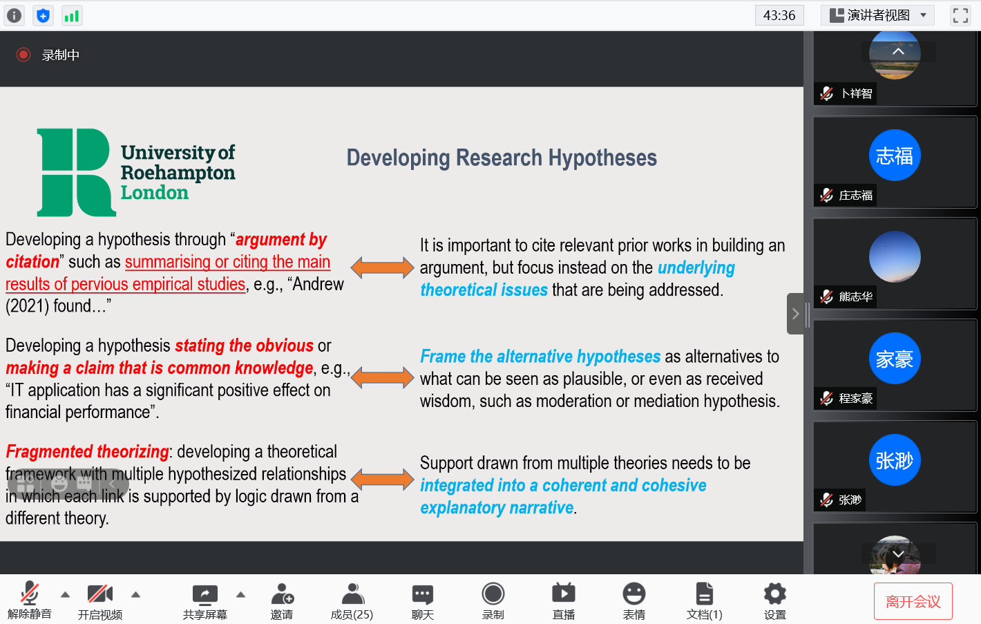 本系列讲座历时四周,每周分别开展一个主题报告。讲座首周,余教授讲授如何开展有趣的话题以及研究问题,并提出,论文研究问题的提出需要研究者找到适合的理论空缺和实践空缺,两项空缺都需要有逻辑严谨的文献综述来支撑。第二周的主题是,如何进行严谨的研究设计和恰当的方法论。余教授讲解了数据收集、数据分析的各种分析方法,以及确保所获数据有效性的措施。第三周,余教授讲解如何撰写论文以及出版管理学顶刊,对论文期刊发表提供了许多注意事项和宝贵经验。最后一周由参会员工汇报自己论文情况,且由余教授对论文进行点评并给出宝贵意见。点评结束后,余教授又针对性地为员工提供文献参考,完善员工论文的知识体系。