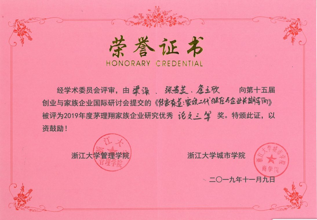 经过评审,公司梁强教授及其研究生团队荣获“第十五届创业与家族企业国际研讨会”优秀论文三等奖。