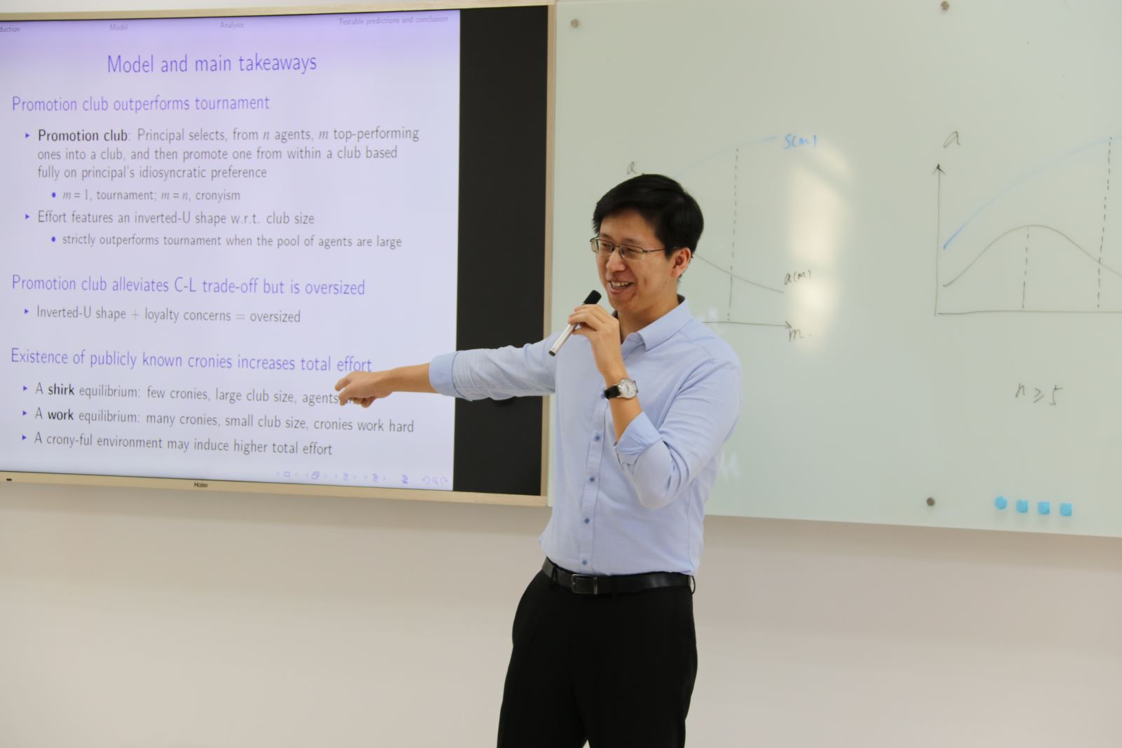 范昕宇博士基于契约理论,通过构建数学模型,分析了决策者自由裁量权所致的忠诚度与工作绩效的相关关系。范博士构建了一个处于“任人唯亲”与“任人唯贤”之间的“晋升俱乐部”模型,并分析、对比了该模型与锦标赛模型,指出在一些情况下锦标赛并非最优的晋升制度,而不同员工规模所对应的最优俱乐部规模可以兼得员工忠诚度与绩效,达到既激发员工工作积极性又提升管理者人事自由裁量权的双赢效果。范博士为晋升制度提供了新洞见,让在场的研究生、本科生对该方面知识有了更深刻地认识。