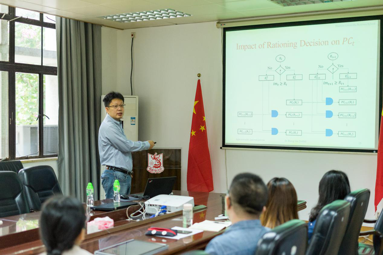 张盛浩教授为在场师生介绍了一个具有两个需求类别、正提前期的周期性回顾、无限期、延期交货库存模型。在这个模型中,高优先级、高缺货的需求总是在每个周期中先于低优先级需求得到满足。张教授先提出一个保留假设(RA),然后构造了RA下基本库存策略的解界和求解过程,导出了RA和LA下具有闭式表达式的最优解。最后,张教授指出这一近似解法可以应用于任何需求分布,并且数值研究证实了保留假设(RA)成立的可能性很大,因此这一模型得出的近似最优的配给和订购策略的性能与最优策略的性能几乎相同。