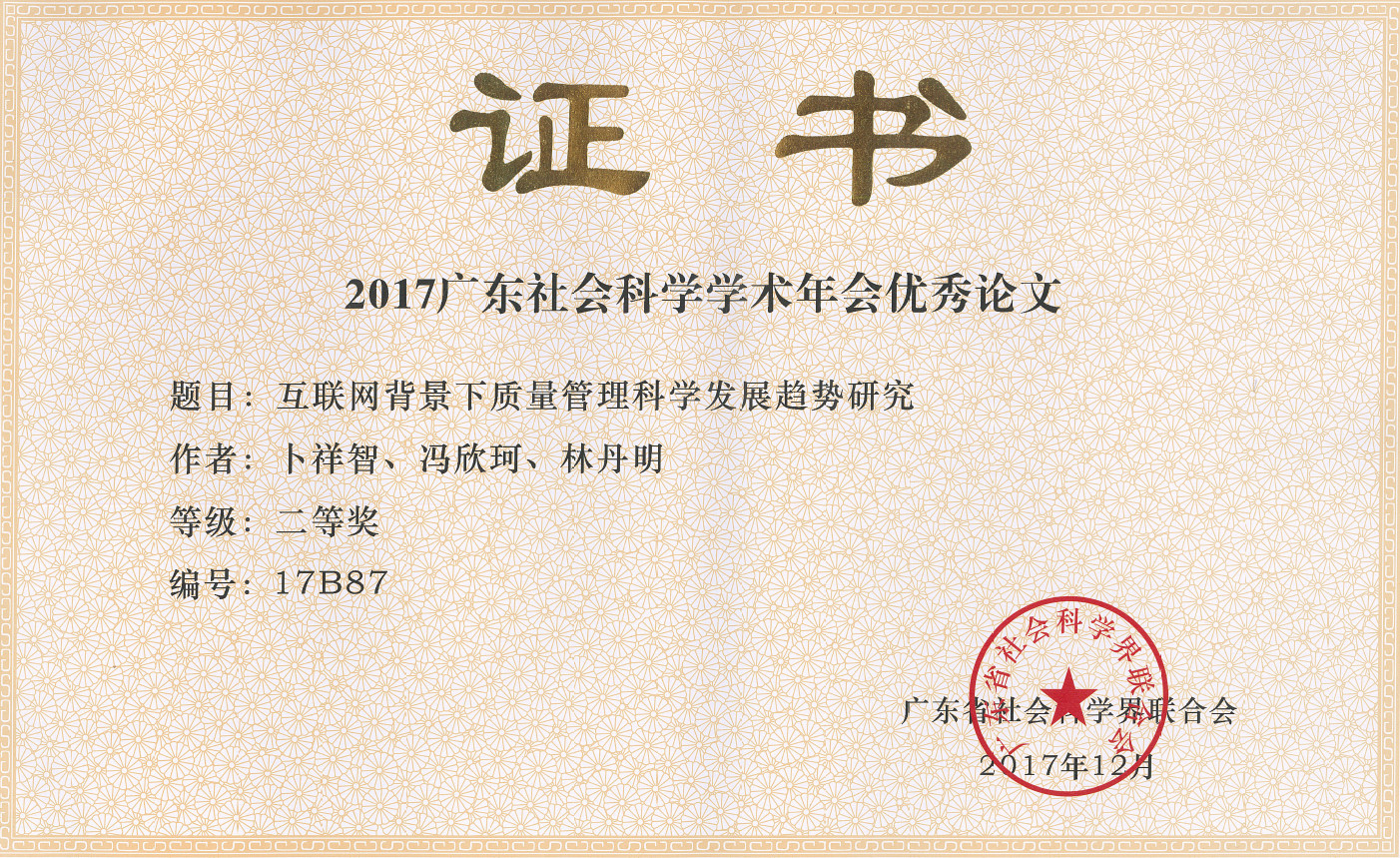 近日,由广东省社会科学界联合会评出的2017广东社会科学学术年会优秀论文奖揭晓,公司卜祥智教授、林丹明教授和冯欣珂同学(2016级硕士研究生)合作研究的成果《互联网背景下质量管理科学发展趋势研究》名列其中,荣获二等奖。