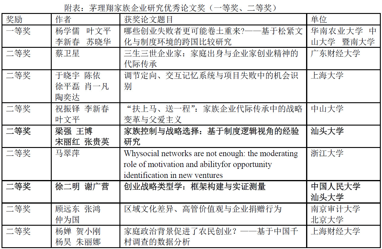 当前是中国民营企业家由第一代向第二代传承的高峰期,也是经济结构调整、企业转型升级阵痛期,还是“大众创业、万众创新”的新时代。聚焦创业和家族企业健康发展的“创业于家族企业成长国际研讨会”,从2005年首创以来,已经成功举办了12届。论坛汇聚世界各地研究家族企业的专家学者,致力于探讨工商家族企业永续发展的内在规律。此外,研讨会还设立了“茅理翔家族企业优秀论文奖”,从2007年开始,每年资助10万元奖励优秀论文作者,尤其是奖励投身家族企业研究的年轻学子,以培养健康向上的中国家族企业研究氛围。2015年开始增设案例研究奖,每届的总奖金增加到15万元。