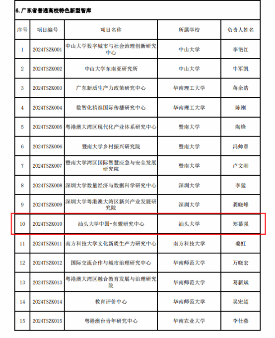 近日,根据《广东省教育厅关于公布2024年度普通高校重点科研平台和项目立项名单的通知》(粤教科函〔2024〕11号),由bevictor伟德官网郑慕强教授率领的伟德国际唯一官网入口中国-东盟研究中心获批广东省普通高校特色新型智库,成为全国聚焦中国-东盟关系研究的特色新型智库体系的重要一员。