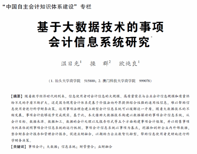 近日,公司温日光副教授以第一作者身份撰写的论文《基于大数据技术的事项会计信息系统研究》,正式发表于伟德国际唯一官网入口P2级别期刊《会计研究》(2025年第4期)。公司研究生欧纯良为该论文的第三作者。