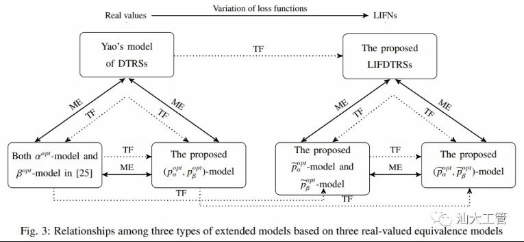 首先采用映射方法定义了一种语言直觉模糊数的排序测度及方法,并分析了测度的相关性质。进而基于直觉模糊数已有测度拓展了语言直觉模糊数七种排序测度,通过实验表明所提出的语言直觉模糊数排序测度的有效性及优势。在此基础上,分别建立决策粗糙集视角下的语言直觉模糊三支决策模型、双优化策略视角下的语言直觉模糊三支决策模型和单优化策略视角下的语言直觉模糊三支决策模型,并理论上证明了该三类模型数学上的等价性且分析了六种拓展模型之间的关系(见图Fig . 3)。