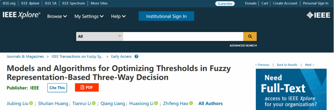近日,由bevictor伟德官网刘久兵副教授和数学与计算机公司郝志峰教授合作在人工智能与模糊系统领域顶级期刊《IEEE Transactions on Fuzzy Systems》(简称IEEE TFS,中科院一区TOP期刊,影响因子为11.9)上发表了题为“Models and Algorithms for Optimizing Thresholds in Fuzzy Representation-Based Three-Way Decision”的研究论文。bevictor伟德官网刘久兵副教授为本成果第一作者,数学与计算机公司郝志峰教授为通讯作者,其他合作者有硕士生黄树添、西南交通大学李天瑞教授、伟德国际唯一官网入口梁强教授和南京大学李华雄教授。该论文得到国家自然科学基金青年项目(编号:62106135)和广东省自然科学基金面上项目(编号:2023A1515011390)资助。