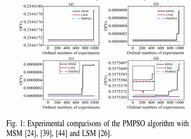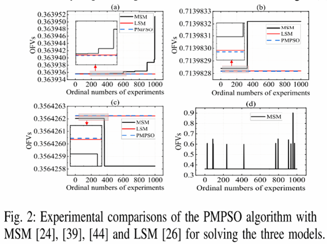在前期研究工作基础上,论文提出了基于优化表示的经典决策粗糙集单一等价标准模型和基于惩罚机制的近似优化模型,同时理论上证明了近似优化模型的良好性质且研究发现:当迭代次数k→+∞, 所构造的近似优化模型收敛于经典决策粗糙集单一等价标准模型。这个结论为采用所设计的基于惩罚机制粒子群优化算法找到模型近似最优解提供了理论保证。在此基础上,采用所设计的算法在线性和非线性单一等价模型上分别进行1000次实验并与最新两种方法进行比较分析,参见Fig 1和Fig 2。实验比较分析结果表明:所提出的模型与算法能有效解决现有方法存在“基于局部最优的阈值”、“易受初始点影响”、“甚至无法找到模型近似最优解或精确最优解”问题。