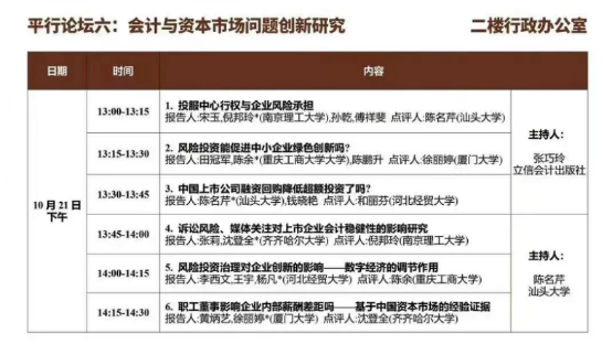 本次论坛共收到143篇学术论文,举办了10个大会主题报告和72个平行论坛报告,并开设了期刊出版社圆桌论坛。在“会计与资本市场问题创新研究”的平行论坛上,陈名芹副教授就“投服中心行权与企业风险承担”报告内容进行点评,并围绕“中国上市公司融资回购率降低超额投资了吗?”主题作论文报告,随后,陈名芹副教授担任平行论坛下半场的主持人,主持后续论文报告与点评工作。会议现场学术氛围浓厚,讨论交流热烈。