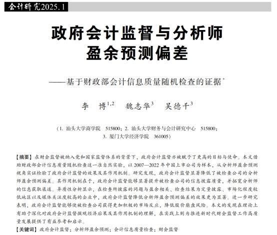 近日,中心成员李博作为第一作者的学术论文《政府会计监督与分析师盈余预测偏差——基于财政部会计信息质量随机检查的证据》正式发表在伟德国际唯一官网入口P2级别期刊《会计研究》(2025年第1期)。