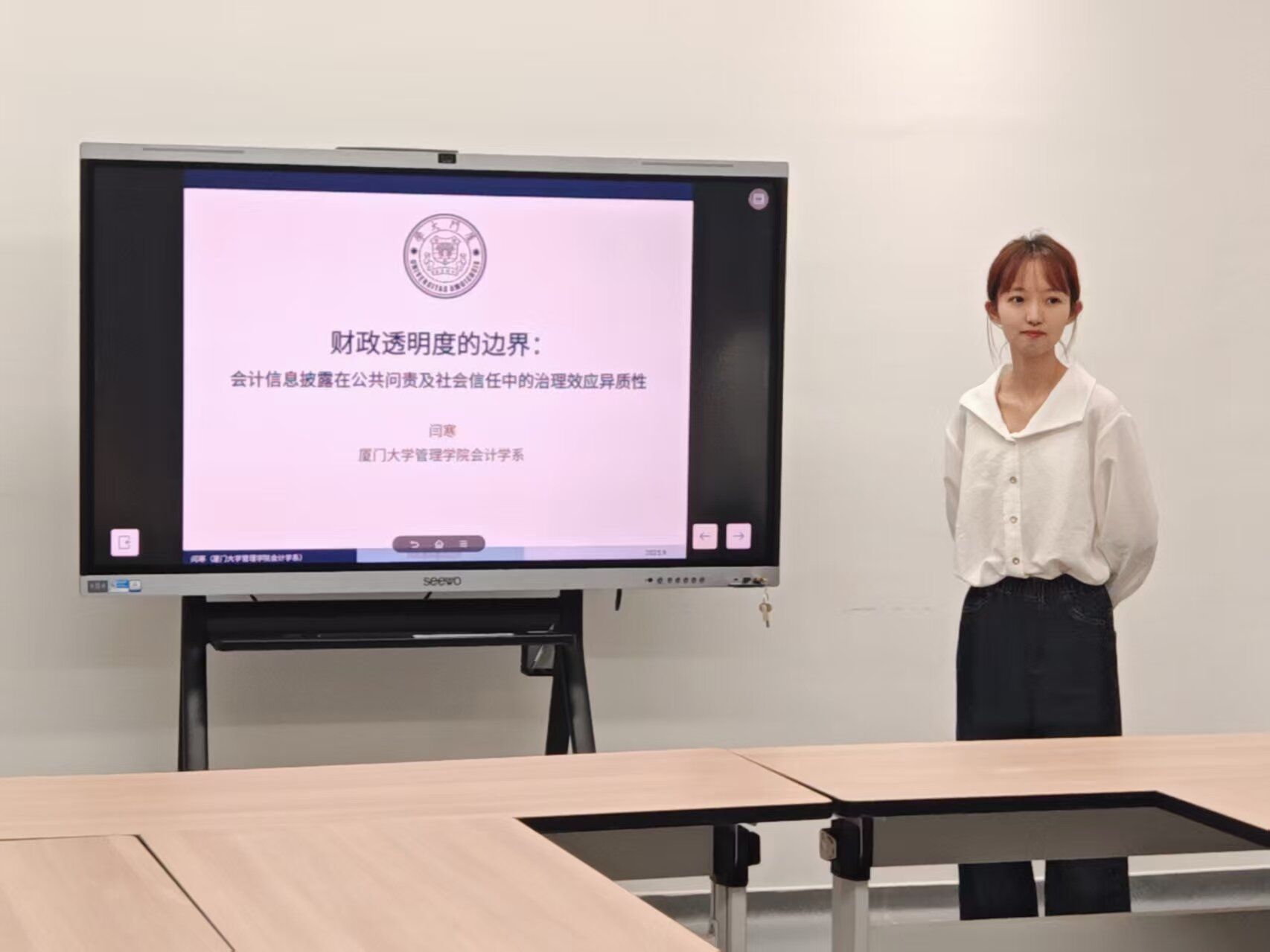 闫寒博士以“财政透明度的边界:会计信息披露在公共问责及社会信任中的异质性治理效应”为主题进行分享。她指出,责任分配是跨区域治理核心议题,环境治理相关会计信息可作为治理失败后的 “补救机制”,能引导公众对政府的归咎态度、修复社会信任损失,印证政府会计在公共问责与社会信任构建中的关键作用。