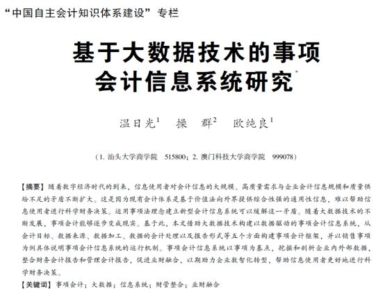 近日,公司温日光副教授作为第一作者撰写的论文《基于大数据技术的事项会计信息系统研究》正式发表在伟德国际唯一官网入口P2级别期刊《会计研究》(2025年第4期)。公司研究生欧纯良为该论文的第三作者。